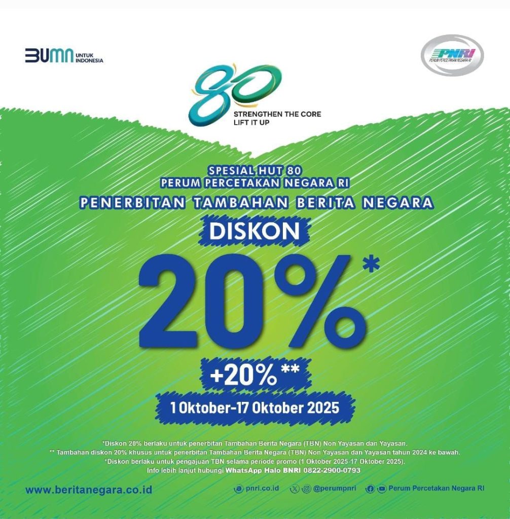 Jakarta, 1 Oktober 2025 – Perum Percetakan Negara RI (PNRI) merayakan hari jadi yang ke-80 dengan menghadirkan program potongan harga penerbitan Tambahan Berita Negara (TBN). Program ini menjadi bentuk apresiasi kepada masyarakat, lembaga, dan mitra yang telah mempercayakan layanan penerbitan resmi kepada PNRI selama delapan dekade. Melalui program ini, PNRI memberikan :