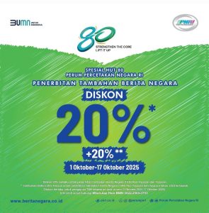 Jakarta, 1 Oktober 2025 – Perum Percetakan Negara RI (PNRI) merayakan hari jadi yang ke-80 dengan menghadirkan program potongan harga penerbitan Tambahan Berita Negara (TBN).